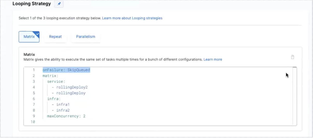 These strategies can be configured in the Advanced Configuration section of the service/environment tabs in the pipeline and are reflected in the YAML under the failureStrategies