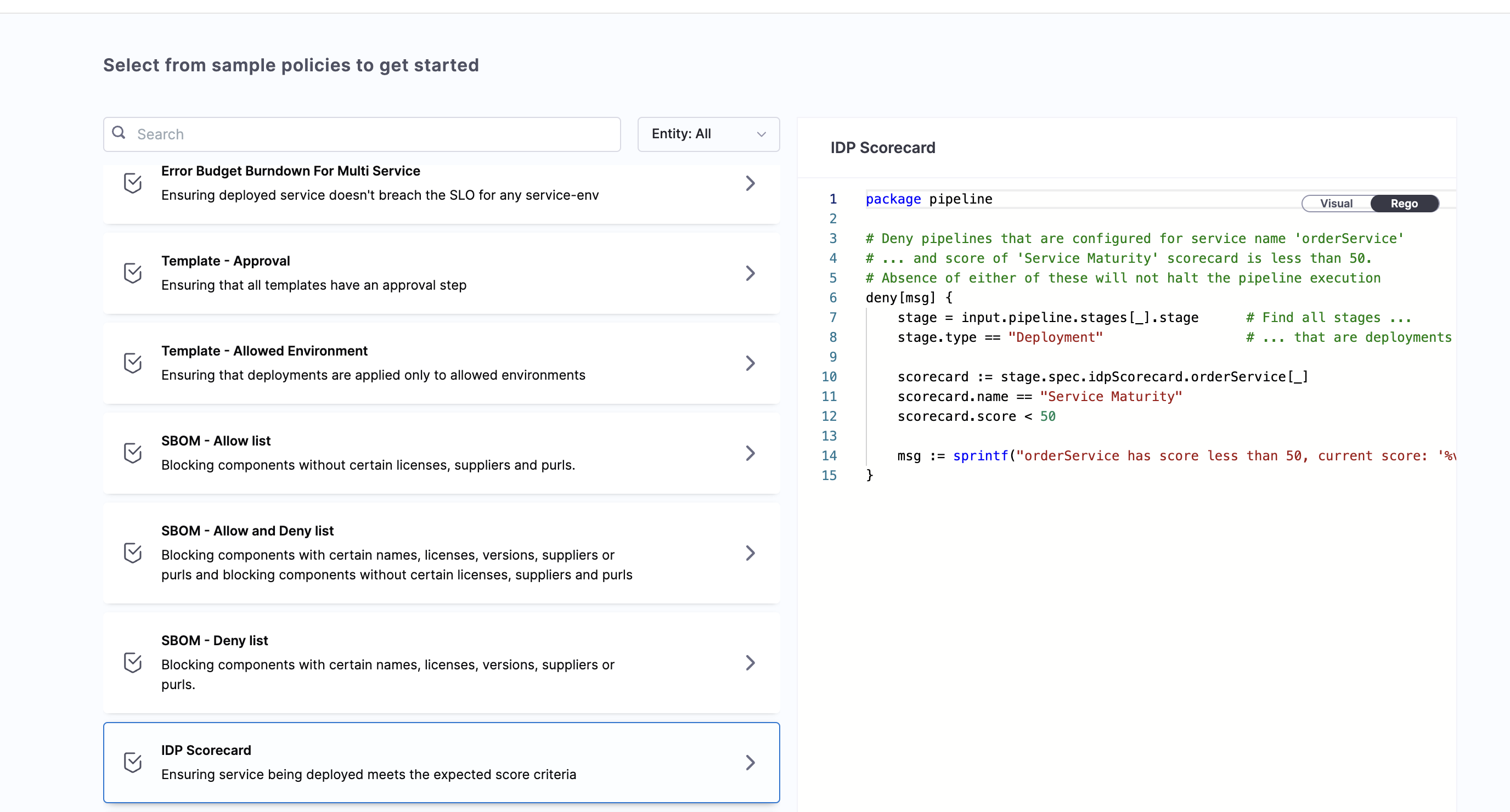 In the REGO script we use stage.spec.idpScorecard.orderService[_]