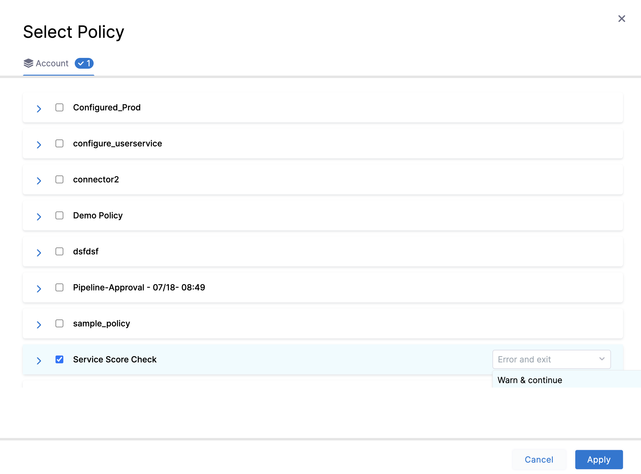 Add the policy you created previously, and then change the type to Warn & Continue. Then select Apply.